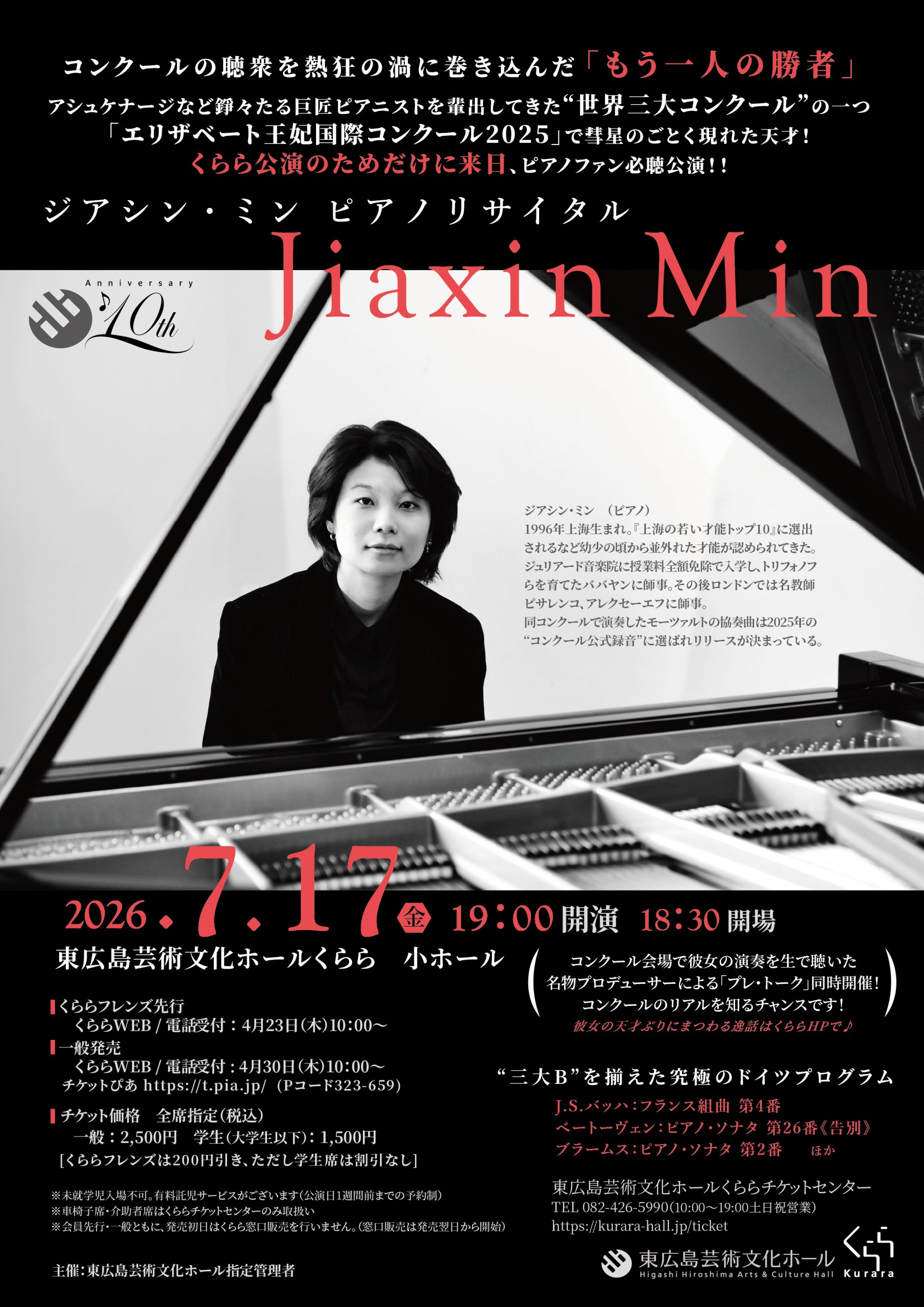 地元ベルギーの放送局は即座に彼女のため特別リサイタルを開催し、チケットはもちろん瞬間蒸発した。そして表彰式直後、私が直接会場で本人に声をかけ緊急来日公演が浜離宮朝日ホールで実現した※。この度のくらら公演も、そのためだけにジアシン・ミンが来日するという超レア公演! 聴衆が熱烈に支持した天才の演奏は絶対に見逃せない!ピアノファンは全員、くららに結集だ!!