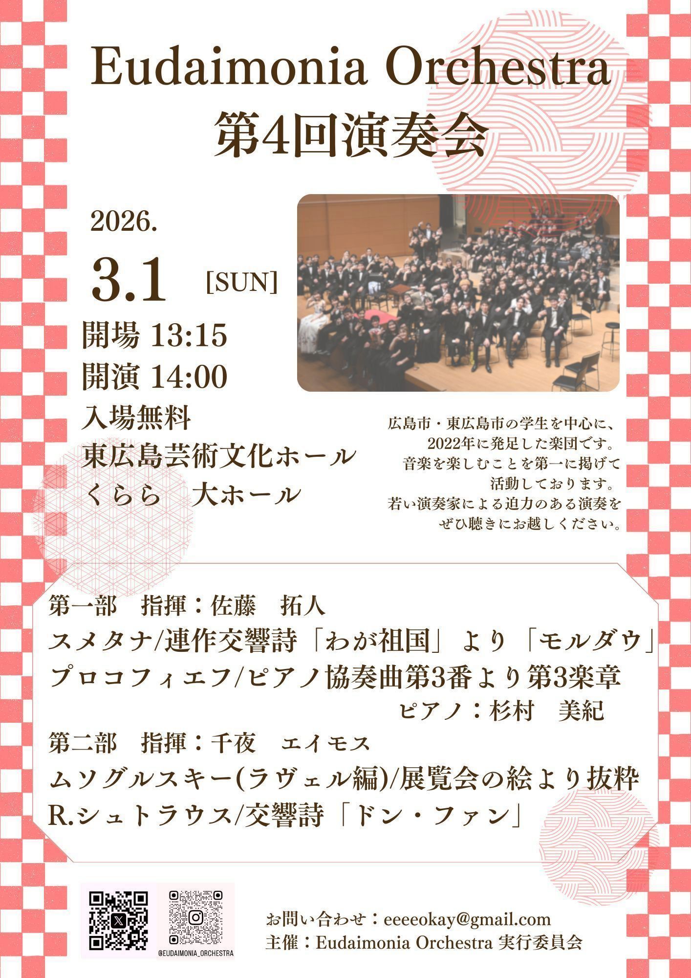 広島の大学生を中心に構成されたオーケストラです!第4回目となる今回は、モルダウやドン・ファンなどの難曲に挑戦します…!若いパワーで力強い演奏をお届けします、ぜひお越しください!
