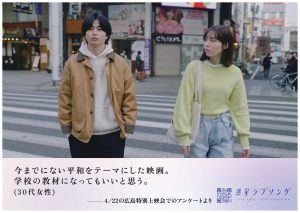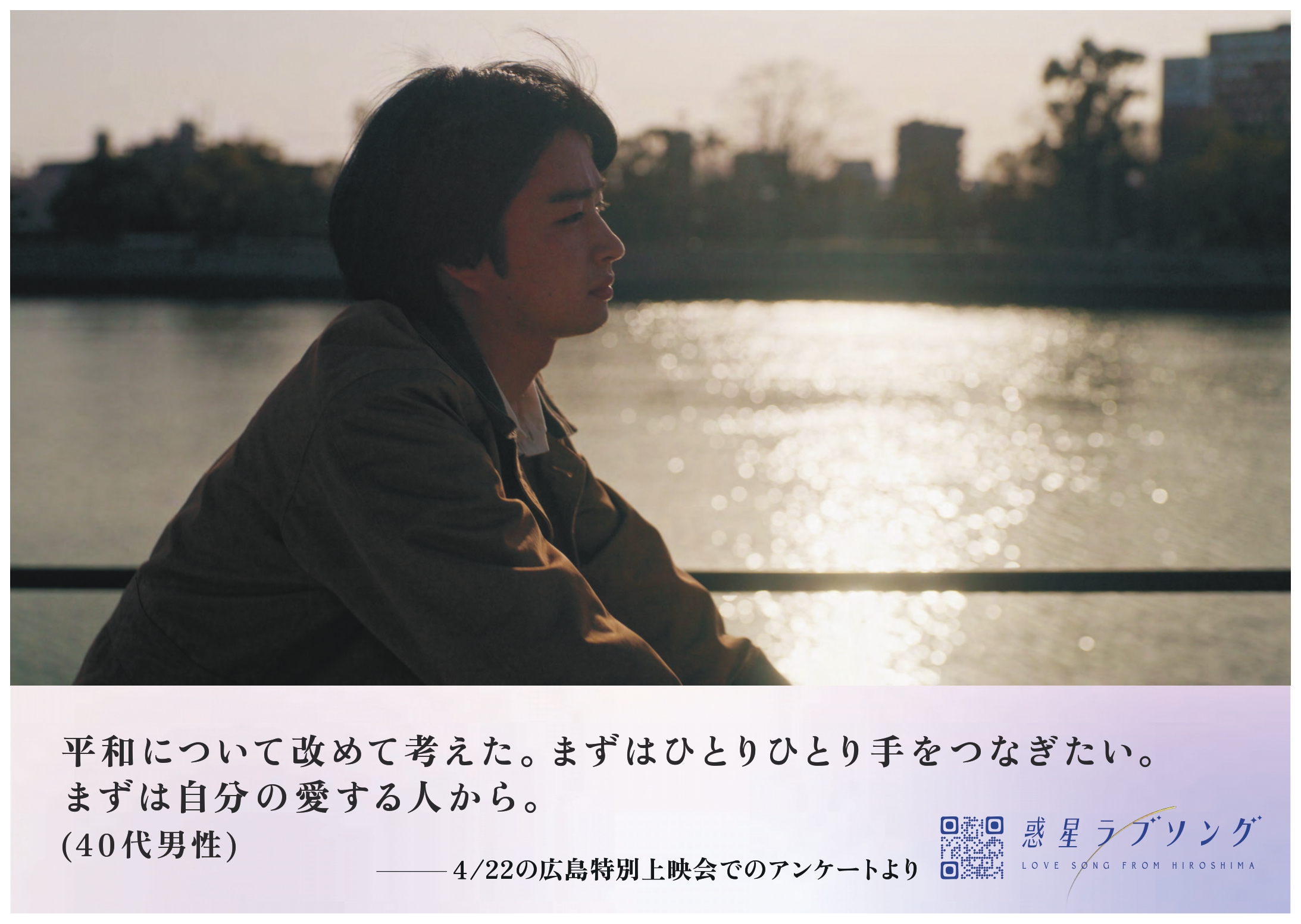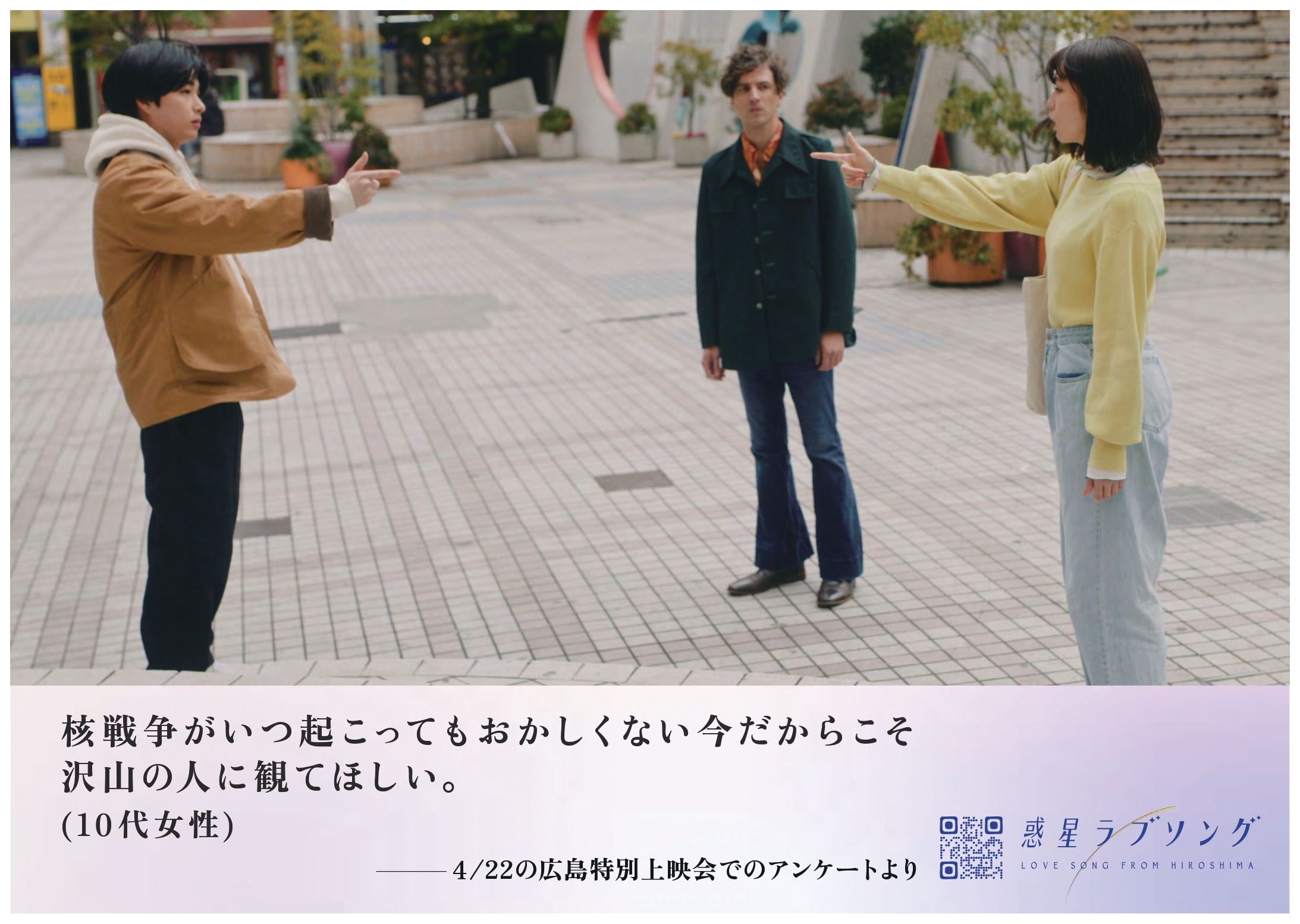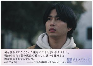 今、世界で戦争していることが本当に痛ましい。 それはかつての広島の痛みと同じである。 核戦争の危機は迫っている。 この星の運命はこの星に住む人たちが握っている。 本当にそう思います。 世界は平和でなければいけない。 そのために自分たちに何ができるのか? もっと多くの若者に感じてもらいたい。 世界の平和について考えさせるこの映画を私たちはあたたかく見守りたいと思います。