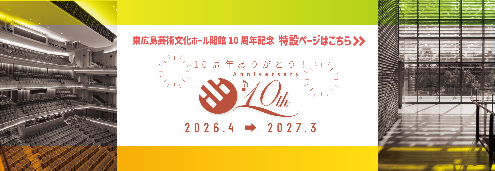 重要なお知らせ 2026年04月01日 東広島芸術文化ホール10周年記念 特設ページ♪ 2026年04月01日 「くららガイドブック」を改訂しました。(2026/4/01) バリアフリー設備等のご案内 東広島芸術文化ホールくらら バリアフリー設備のご案内 フロアガイド ピックアップ催し物一覧 主催・共催 小ホール 2026年 7月17 日(金) ジアシン・ミン ピアノリサイタル 主催・共催 小ホール 2026年6月19日(金) くららシネマシリーズ 「TOKYOタクシー」 主催・共催 大ホール 2026年11月22日(日) 大瀬戸千嶋 結成20周年記念コンサート「Sound of Kurara」 主催・共催 大ホール 2026年8月7日(金) 南こうせつコンサートツアー2026 ~君と僕のうた~ 主催・共催 小ホール 2026年6月13日(土) 「オペラそうだったのか!!」オペラティックコンサート 大ホール 2026年7月20日(月・祝) ソロデビュー40周年アニバーサリー 岡村孝子コンサート2026 “ T’s GARDEN ” 主催・共催 大ホール 2026年4月18日(土) 【募集終了】2026年度 くらら♪ピアノの日 主催・共催 サロンホール 令和8年度くららアートアカデミー「合唱ワークショップ」参加者募集 主催・共催 大ホール 2026年8月1日(土) 松井秀太郎 ナカリャコフ 児玉隼人 トランペットの祭典 主催・共催 大ホール 2026年4月26日(日) 森山直太朗 Two jobs tour 2025〜26『あの世でね』〜「弓弦葉」と「Yeeeehaaaaw !」〜 催し物一覧へ 新着情報のおしらせ 2026年04月02日 2026年5月抽選会と市民ギャラリー空き情報のお知らせ 2026年04月01日 くらら市民文化芸術活動サポートプログラム2026募集開始のお知らせ 2026年04月01日 令和8年度くららパートナーシップ事業のお知らせ 2026年03月25日 2026年4月 近隣駐車場混雑予想について(交通アクセスのご案内) 2026年03月02日 2026年4月抽選会と市民ギャラリー空き情報のお知らせ もっと見る