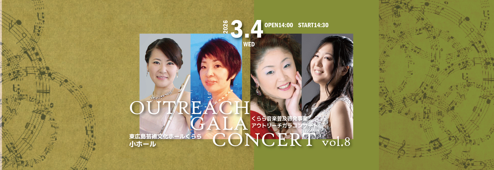 重要なお知らせ 2025年10月01日 市役所庁舎駐車場の利用料変更について 2025年07月01日 「くららガイドブック」を改訂しました。(2025/7/01) 2025年07月01日 市営岡町駐車場の民営化と利用料の変更について 2025年05月02日 くららインターネットに係るチケット販売手数料改定のお知らせ バリアフリー設備等のご案内 東広島芸術文化ホールくらら バリアフリー設備のご案内 フロアガイド ピックアップ催し物一覧 主催・共催 大ホール 2026年4月26日(日) 森山直太朗 Two jobs tour 2025〜26『あの世でね』〜「弓弦葉」と「Yeeeehaaaaw !」〜 主催・共催 サロンホール 2026年2月28日(土) くららレジデンシャルアーティストによるコンサート 主催・共催 小ホール 2026年3月20日(金・祝) 【募集中】東京藝術大学音楽学部 早期教育プロジェクト2025 in 東広島 主催・共催 小ホール 2026年3月4日(水) くらら登録アーティストによる アウトリーチ ガラコンサート VOL.9 主催・共催 大ホール 2026年3月14日(土) 広島交響楽団ドラゴンクエストコンサート「ドラゴンクエストⅤ」天空の花嫁 主催・共催 大ホール 2026年3月7日(土) くらら★ダンスの日2025 主催・共催 サロンホール 2月21日(土) くらら文化講座「こども・おとなオープンカレッジ2025」 主催・共催 小ホール 2026年2月14日(土) 市民参加型ダンス公演「みんな de ダンス‼ 」Vol.2 催し物一覧へ 新着情報のおしらせ 2026年01月07日 【1/10~募集開始】2026年度くららロビーコンサート 出演者募集 2025年12月25日 2026年1月 近隣駐車場混雑予想について(交通アクセスのご案内) 2025年12月15日 2026年度 くららロビーコンサート 出演者募集のお知らせ 2025年11月27日 2025年12月 近隣駐車場混雑予想について(交通アクセスのご案内) 2025年10月04日 広報誌 [Seed] 10・11月号発行しました! もっと見る